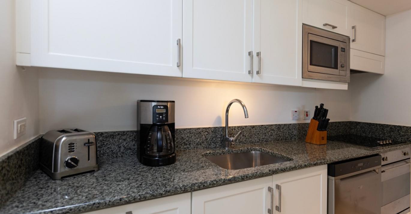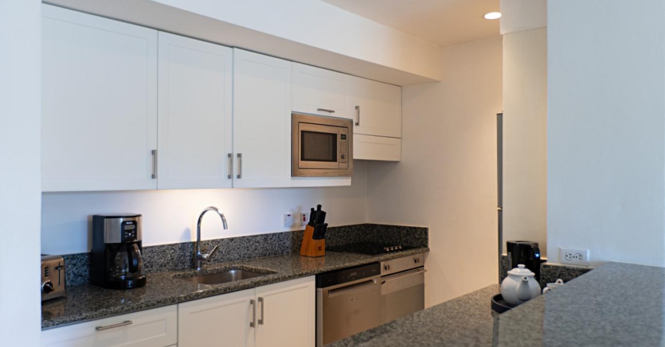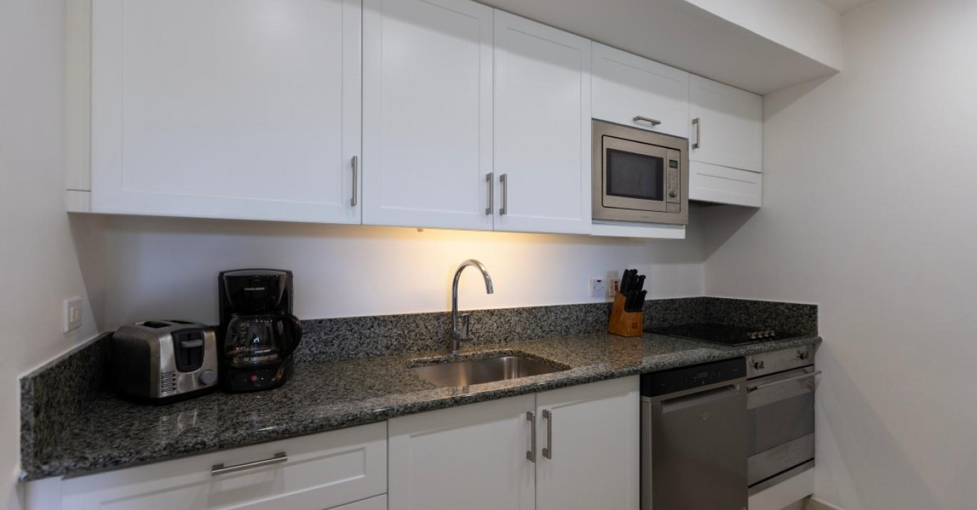 Schooner bay is a beachfront condominium that consists of three blocks of apartments with a freeform swimming pool as the focal point. Chilterns is a delightfully spacious one-bedroom, two-bathroom apartment with all the finishes one would expect to find in a penthouse unit, with marble floors, marble bathrooms, custom-made Italian kitchen and granite work surfaces. It is furnished with a Caribbean flavour to compliment the cool, natural tones of the floors and walls.