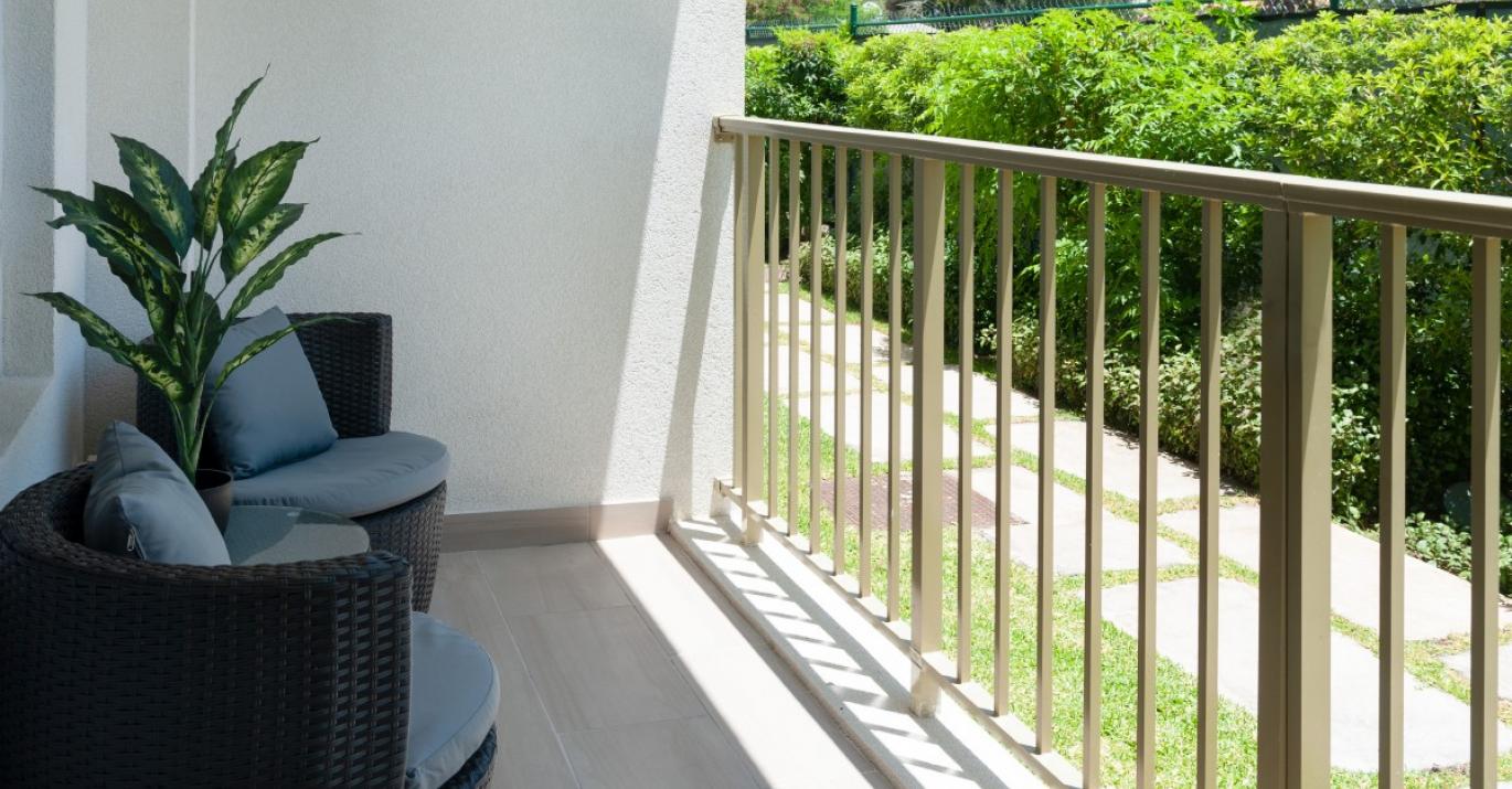 The main bedroom is a haven of relaxation, featuring a sumptuous queen-size bed, a spacious walk-in closet, and a pristine en suite bathroom. The second bedroom has a double bed. Start your mornings with a cup of coffee on your private patio, or simply relax in the lush gardens, enveloped by the tranquil ambiance.