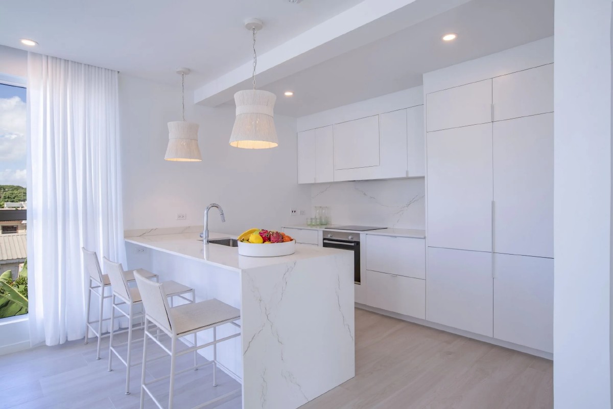 Upon entering, you are greeted by enchanting decorative lighting and large windows that frame the lush Caribbean landscape, setting a tranquil and inviting ambiance. The living room is adorned with exquisite decor, creating a serene retreat for relaxation and leisure. The master suite and guest bathroom are appointed with lavish features, including a double vanity and a walk-in shower with dual options in the master suite. The guest bathroom showcases a glass-paneled walk-in shower and a sophisticated white marble single vanity. The open-plan living area and kitchen offer an unparalleled experience, featuring handcrafted marble surfaces and fully integrated appliances.