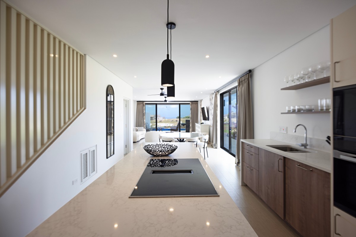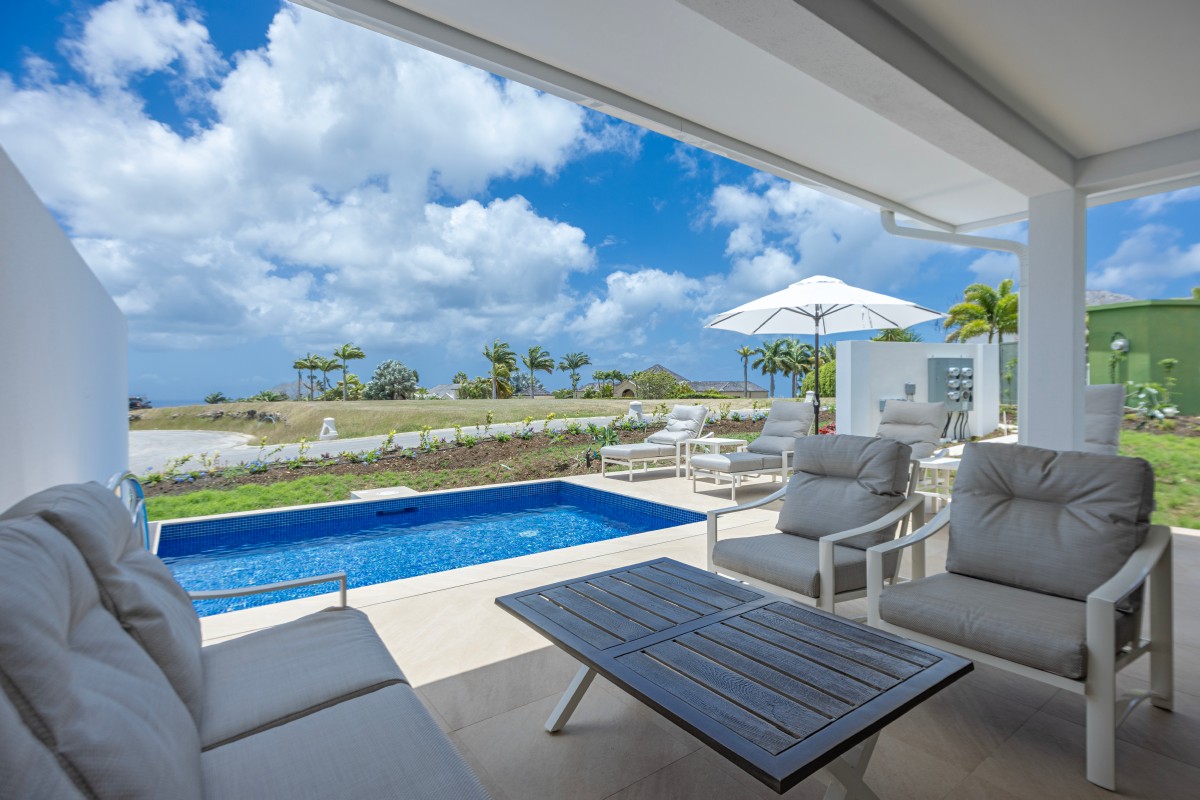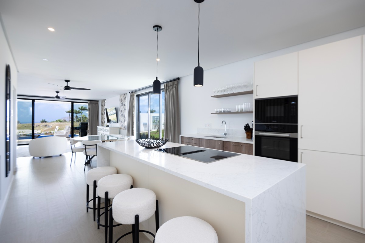 Upon entering, you’re welcomed by a bright and airy foyer that leads into an open-plan living space enhanced by high ceilings and elegant finishes. There is a powder room for guests, a bedroom with en suite bathroom and a modern kitchen which flows effortlessly into a spacious living and dining area, creating the perfect setting for entertaining or unwinding after a day in the sun. Large glass doors open onto a private outdoor terrace, complete with comfortable seating and your own plunge pool—ideal for soaking up the tropical ambiance in complete privacy.