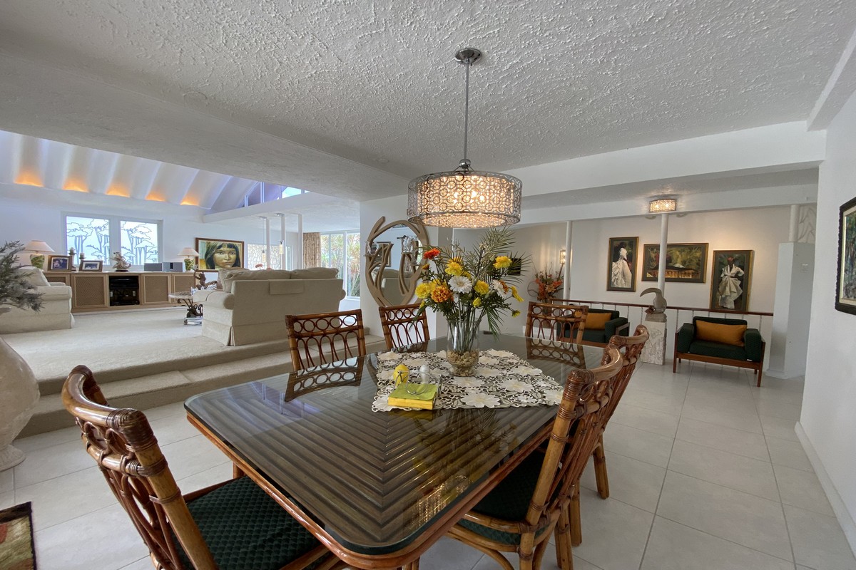 Elevated with great breezes and some cheeky sea views, the property has a very grand staircase to the main entrance to the home. The open plan living and dining room leads to a spacious patio, ideal for entertaining, with a covered area and large wet bar with granite countertops.