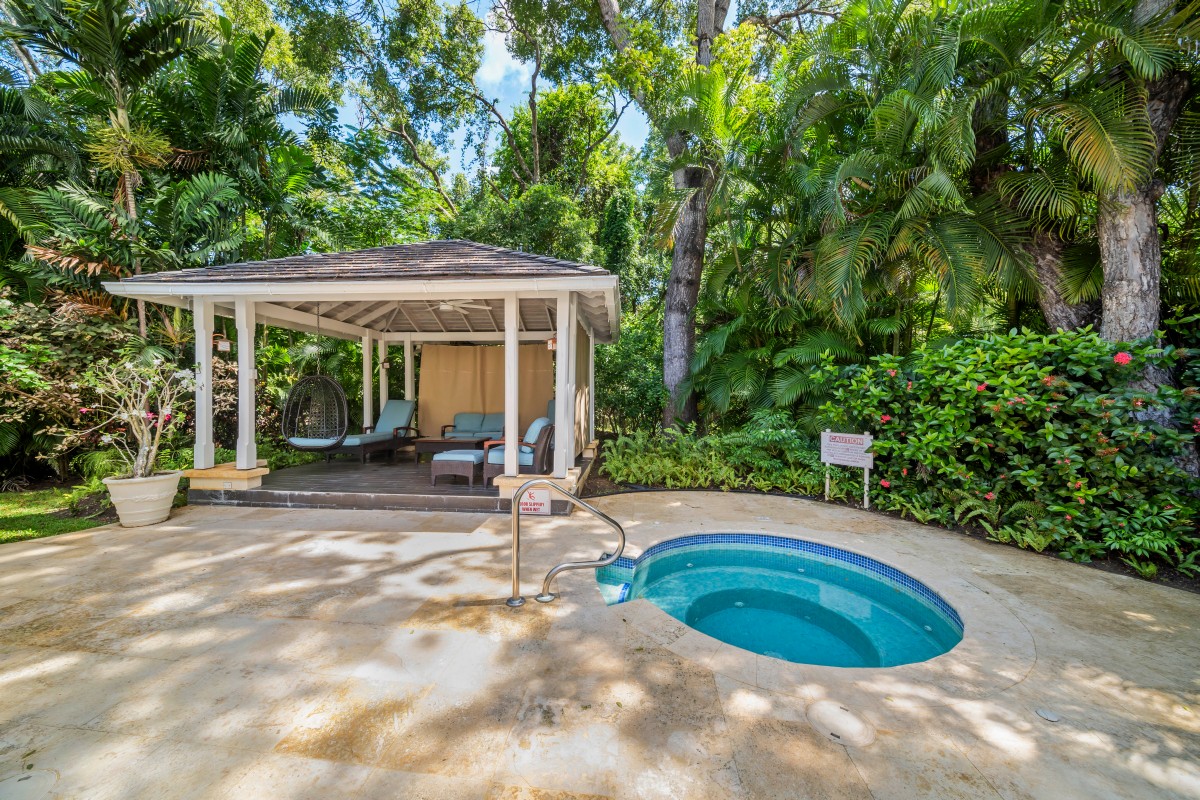 From the moment you step onto the open-air terrace, you’ll be captivated by the breathtaking views of the lush gardens, sparkling pool, and serene Jacuzzi. This space is designed for relaxation, whether you're basking in the sun by the pool, enjoying a quiet afternoon tea in the charming Spanish-style gazebo, or taking in the picturesque scene of the nearby 3rd tee of the Old Nine Sandy Lane Golf Course. A private garden gate allows easy access for peaceful morning walks or jogs, making this Sandy Lane villa even more special.