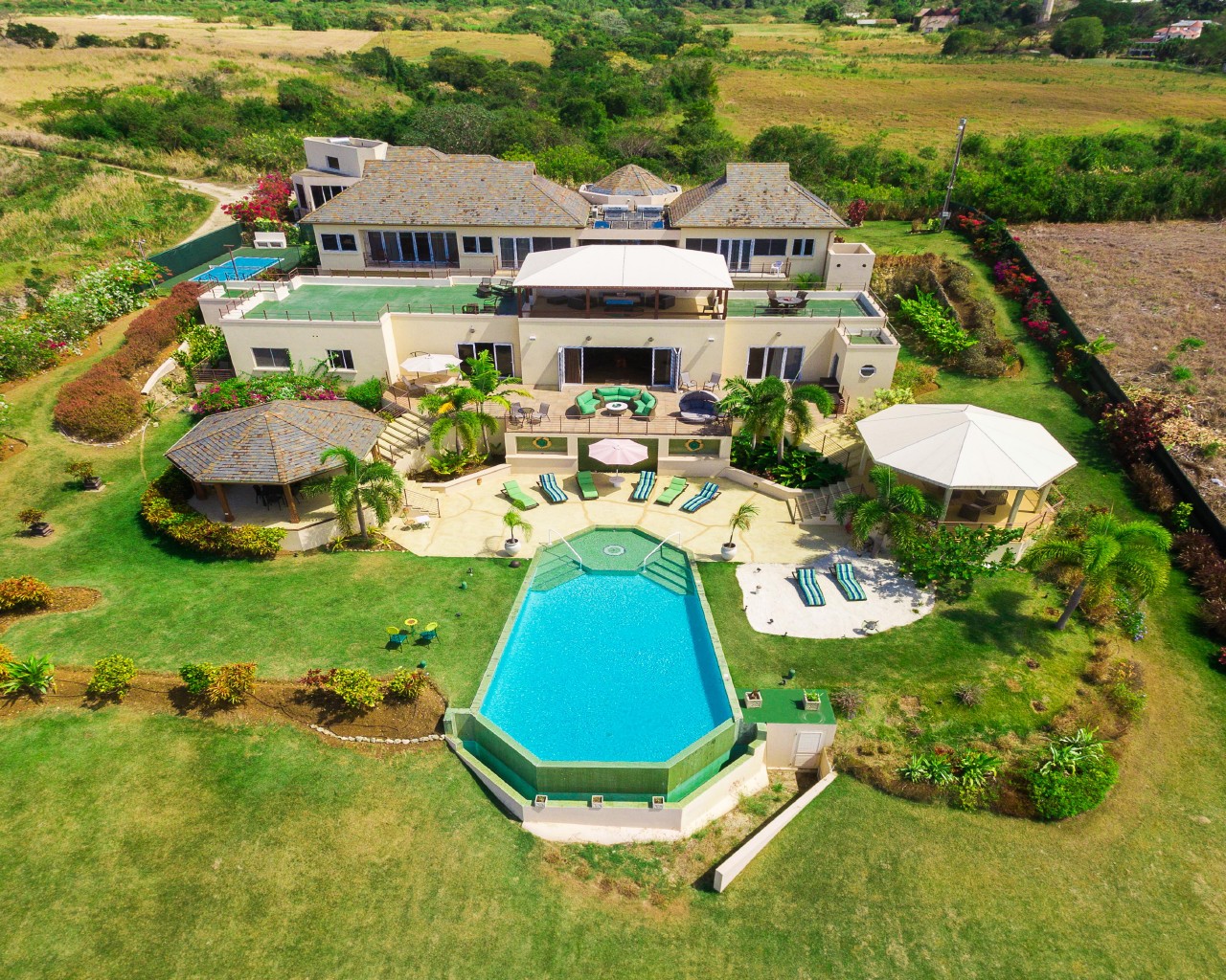 Stepping outside, an expansive split-level terrace unfolds, ideal for lounging, sunbathing, and al fresco dining under the stars. Twin gazebos frame the art-deco infinity pool, while a private sanded “beach” area adds a playful touch of island charm. A hot tub/Jacuzzi and dedicated spa room invite guests to unwind and rejuvenate in true Caribbean style.