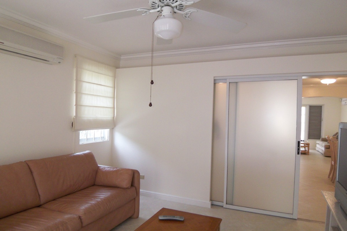 Kasaka 2 – On the ground floor there is an open plan kitchen, living and dining area, a powder room and an area for the washer/dryer and utility closet. There is a back door which leads on to the paved back yard. Upstairs there are 2 large ensuite bedrooms both with private balconies and private patios. The entire townhouse is air-conditioned. There are also wrought iron grills and a security alarm. It is fully furnished.