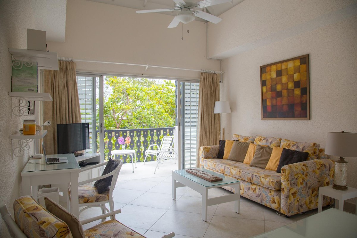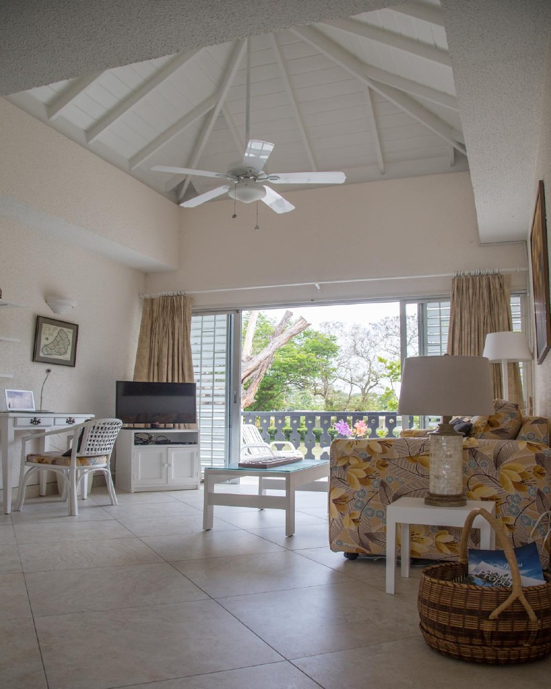 Golden Grove 235 is a fabulous 1-bedroom 1-bathroom property, which is becoming available for the first time in 32 years and offers a number of special features. Its location in the centre of the Golden Grove cluster offers an undisturbed view of the 1st Fairway of the Rockley Golf Course on one side and of the picturesque pool on the other. It faces both East and West, allowing for lovely morning and afternoon light and a refreshing cross-breeze throughout the day. Being on the upper first (American second) floor, both living and bedrooms feature high dome-shaped cathedral ceilings which give the apartment a spacious and airy feel. Most notably, this property also comes with a rarely available very spacious and fully covered second patio. Overlooking the pool and boasting its own elevated plant bed of succulents, this space makes for a wonderful second living room, lounging, outdoor dining and entertainment area.