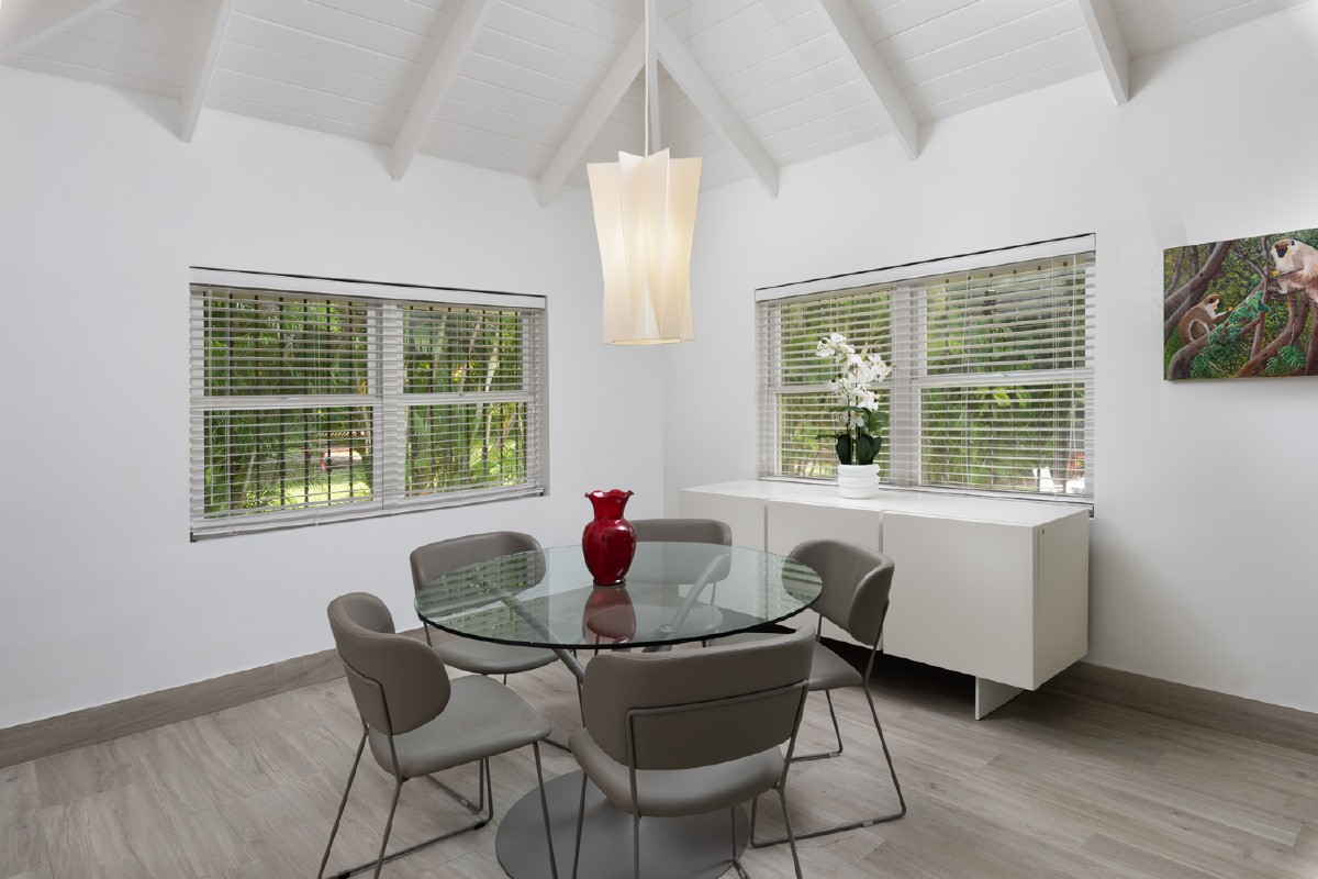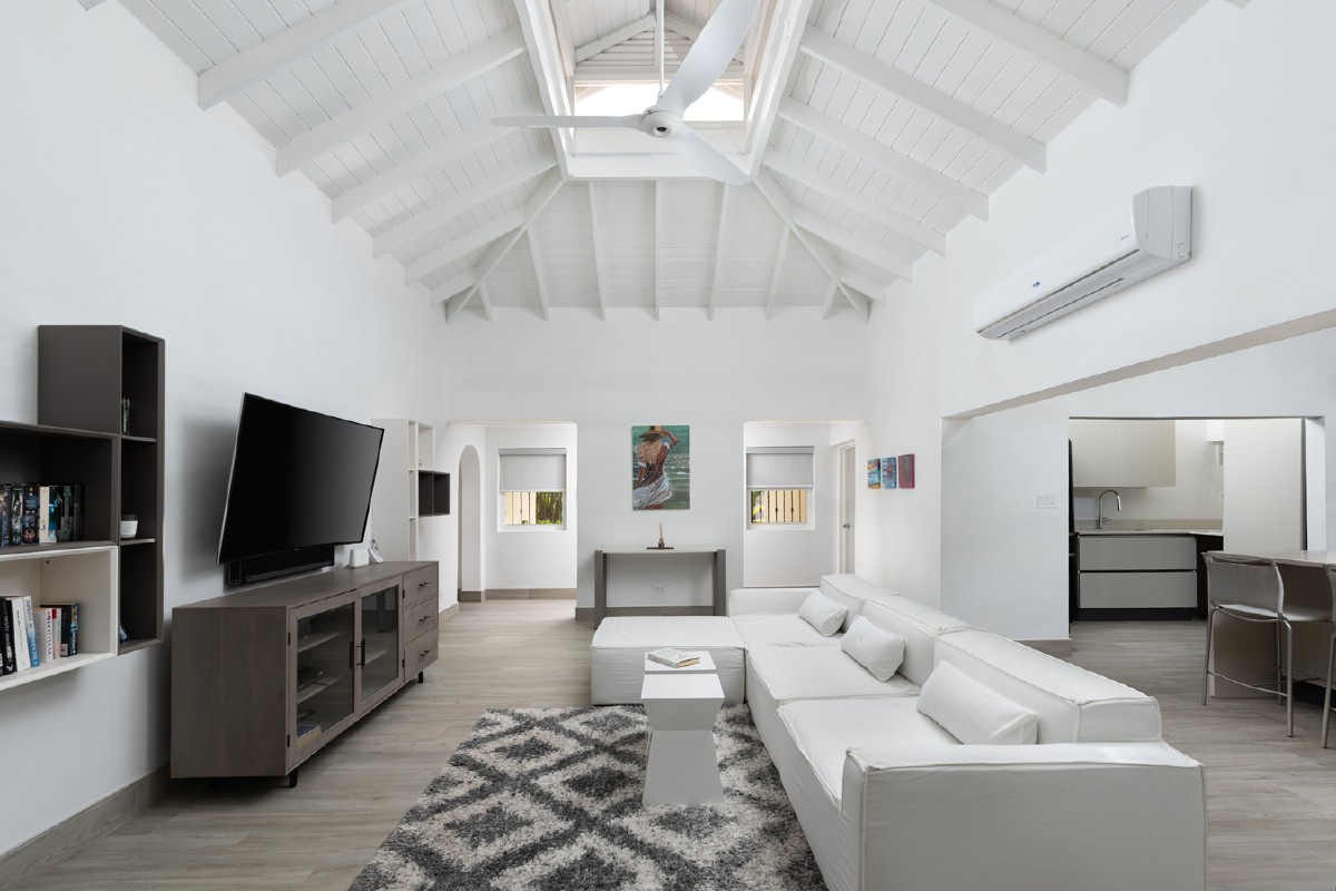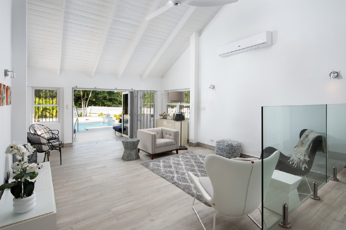 The villa unfolds across gentle levels, enhancing the sense of flow. From the family room and kitchen, a few steps lead down to the sitting room, a warm, inviting space with high ceilings and soft natural light. Large doors open seamlessly onto the covered patio and pool, delivering the easy indoor–outdoor lifestyle that defines the best of Caribbean living, ideal for relaxed mornings, casual lunches or evening entertaining.