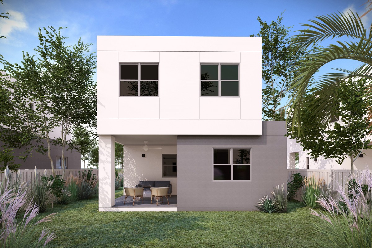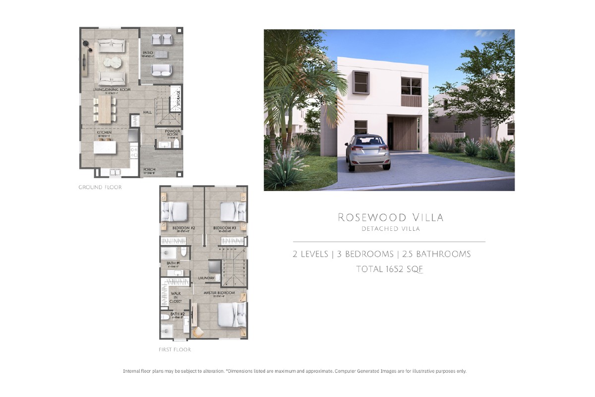 One of the available home designs is Rosewood, a spacious three-bedroom, two and a half-bathroom residence featuring an open-plan layout, a fully equipped kitchen with appliances, a master suite with a walk-in closet, a large patio, a paved parking area, a fenced backyard, and a landscaped garden