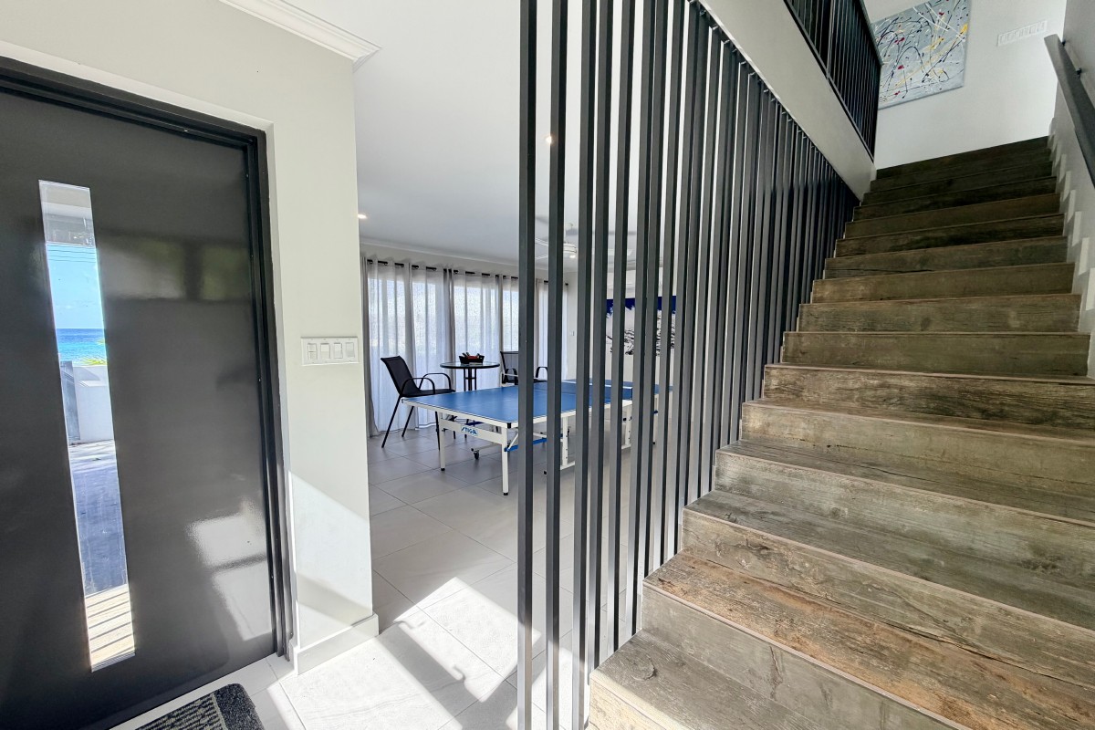 The property is fully screened throughout, including automatic screens on both the upstairs and downstairs sliding doors. From this upper level, there is a panoramic sea view which is secured, as there is no land to develop across the road, simply a boardwalk and the ocean.