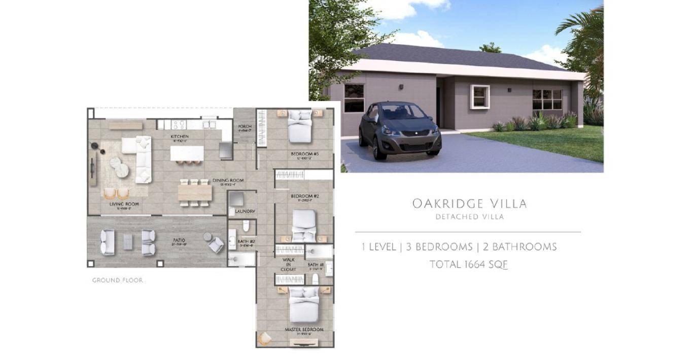 Oakridge – (this design sold out quickly in Phase 1) with only Unit No. 14 remaining for Sale. It is a spacious three-bedroom, two-bathroom home with an open-plan layout, a fully equipped kitchen, master suite with walk-in closet, large patio, paved parking, fenced backyard, and landscaped garden.