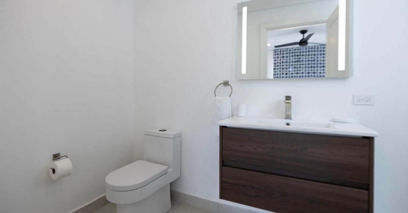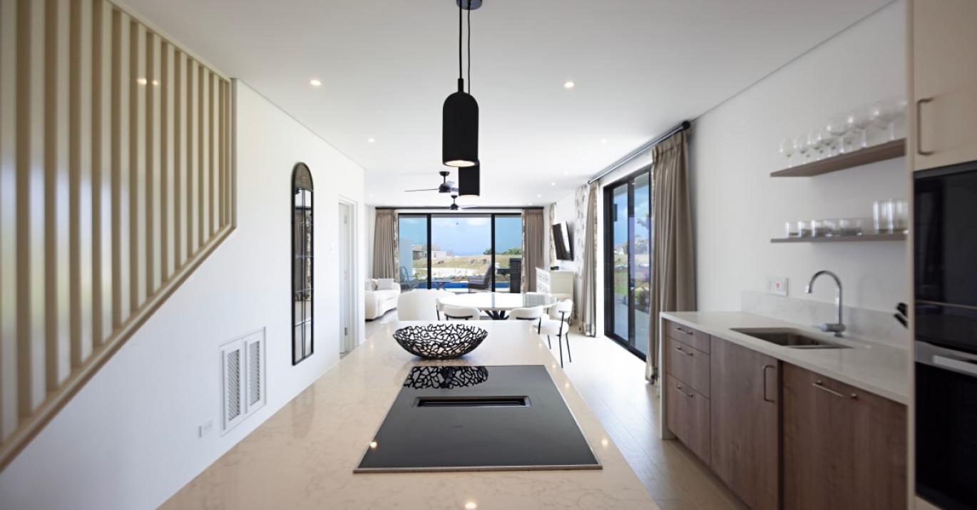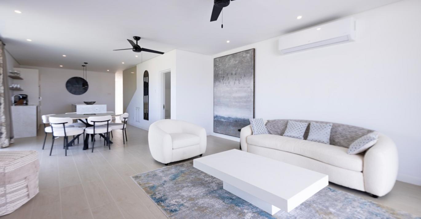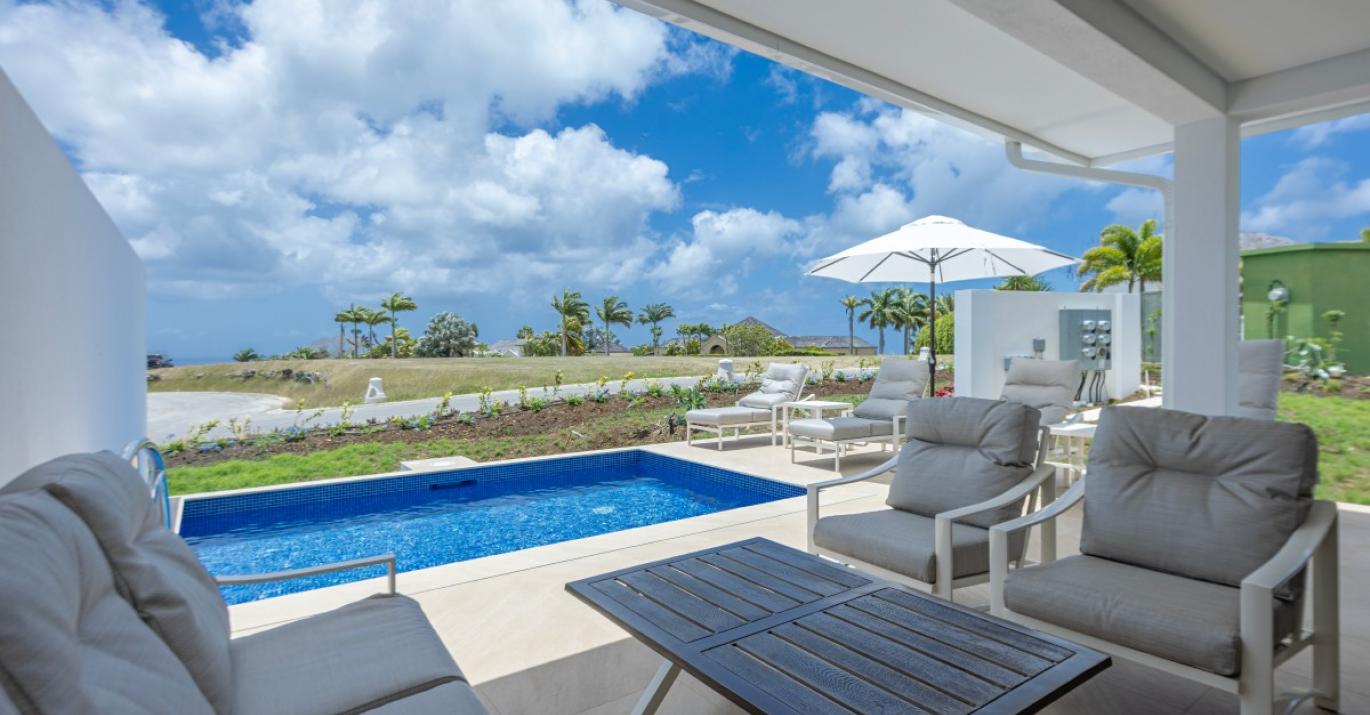 Upon entering, you’re welcomed by a bright and airy foyer that leads into an open-plan living space enhanced by high ceilings and elegant finishes. There is a powder room for guests, a bedroom with en suite bathroom and a modern kitchen which flows effortlessly into a spacious living and dining area, creating the perfect setting for entertaining or unwinding after a day in the sun. Large glass doors open onto a private outdoor terrace, complete with comfortable seating and your own plunge pool—ideal for soaking up the tropical ambiance in complete privacy.