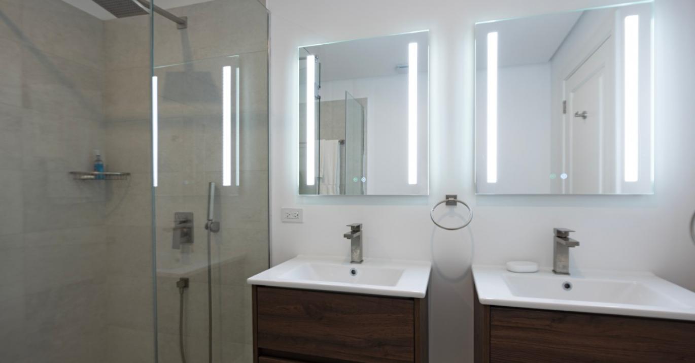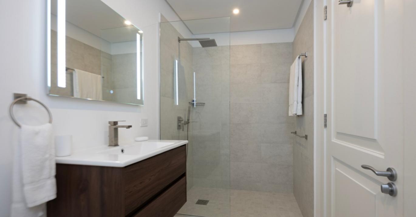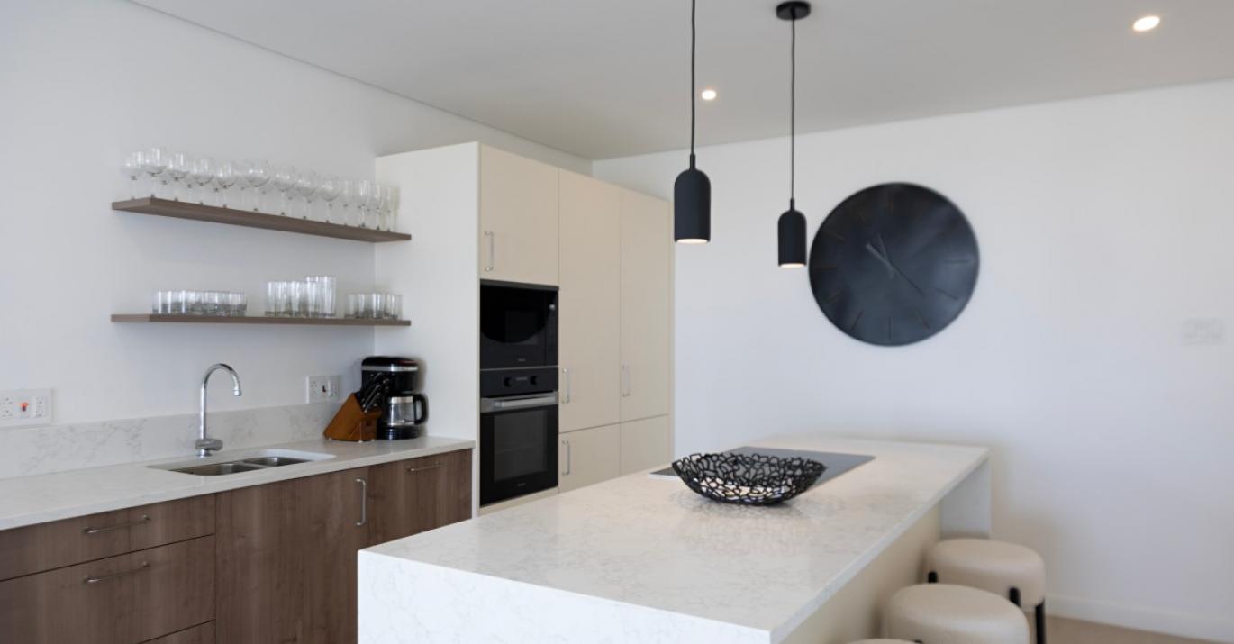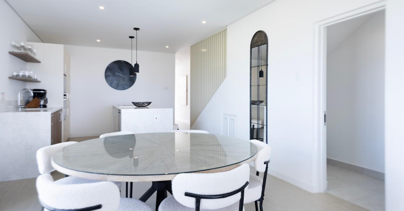 Upon entering, you’re welcomed by a bright and airy foyer that leads into an open-plan living space enhanced by high ceilings and elegant finishes. There is a powder room for guests, a bedroom with en suite bathroom and a modern kitchen which flows effortlessly into a spacious living and dining area, creating the perfect setting for entertaining or unwinding after a day in the sun. Large glass doors open onto a private outdoor terrace, complete with comfortable seating and your own plunge pool—ideal for soaking up the tropical ambiance in complete privacy.