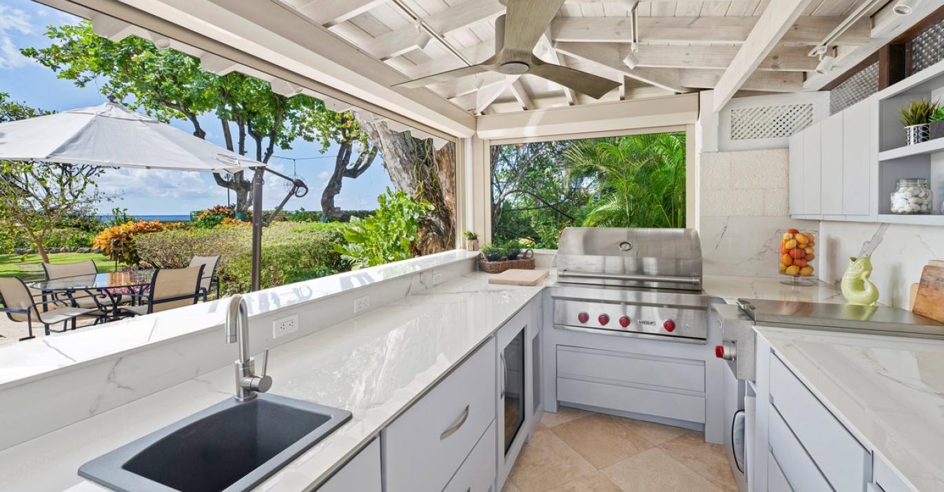 Sand Dollar boasts two fantastic kitchens: one in the main house and an outdoor garden kitchen. Both are fantastic spaces that will delight any chef as they are fully equipped. The outdoor kitchen is brand new and fitted with electric shutters that close the entire space when not in use, protecting it from the elements. This sleek and elegant space, with high counter and bar stools, is a centerpiece while entertaining and enjoying time with friends and family. There is also a covered dining terrace perfectly positioned between both kitchens with a beautiful round table which seats 10. A garden gazebo near the sea completes the array of dining options with a lovely 6-seater dining table.