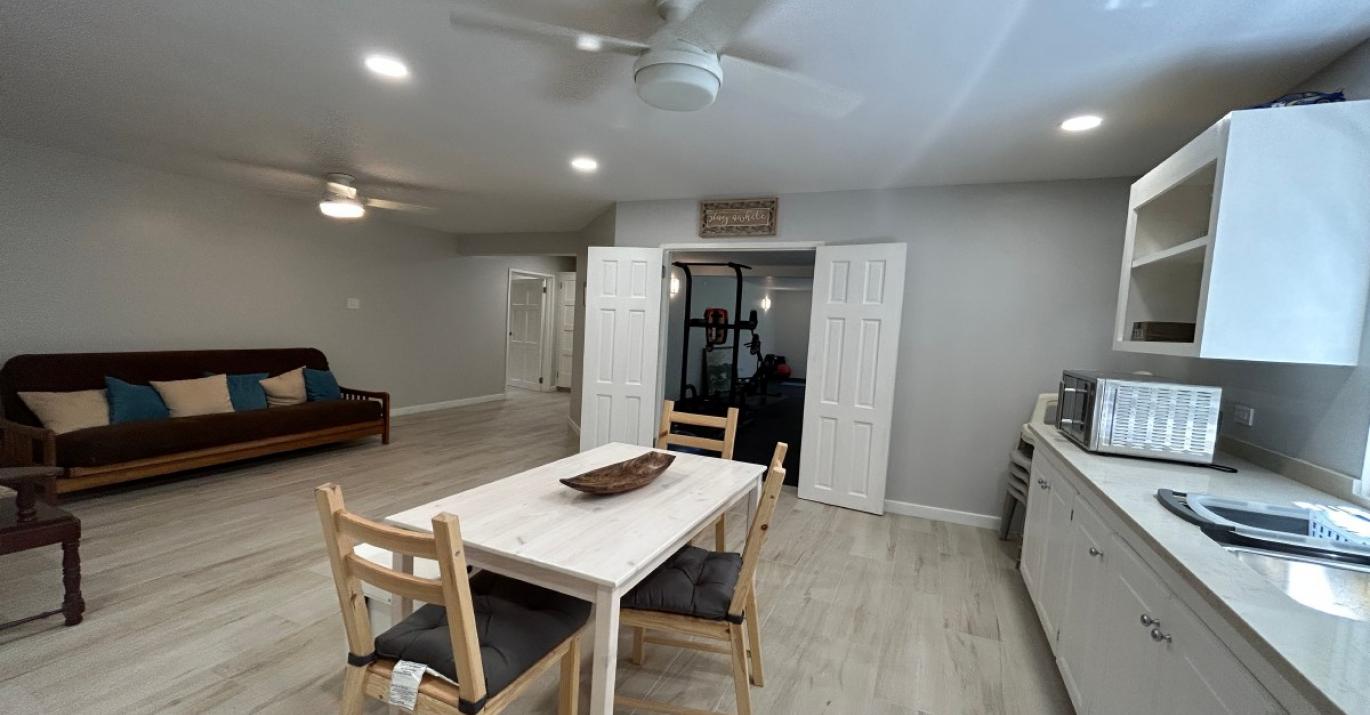 The lower level consists of a 2 Bedroom, 1 Bathroom flat with large gym. Both bedrooms are outfitted with ceiling fans and A/C and there is wrought iron throughout the lower level.